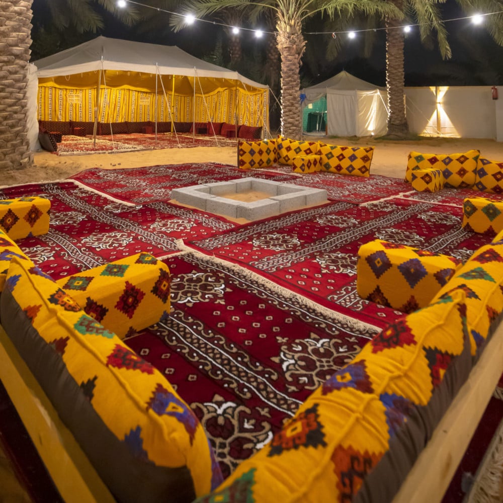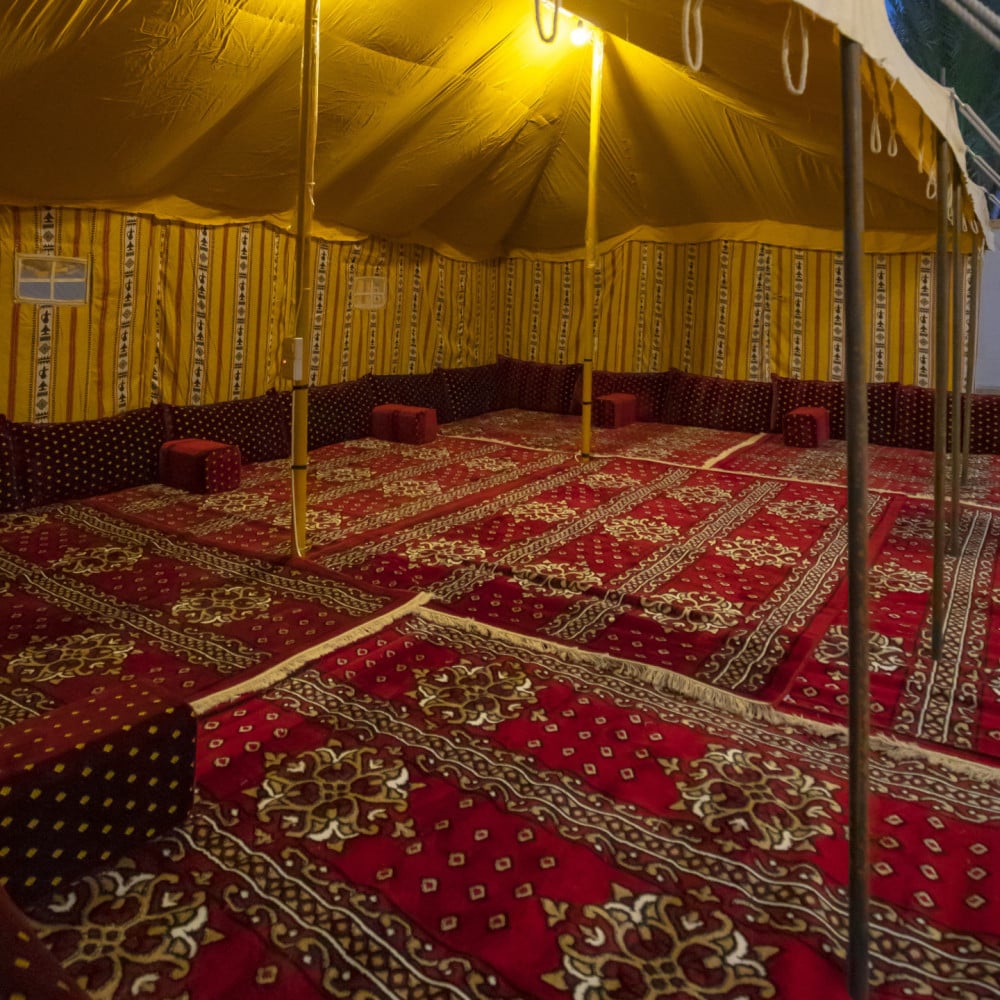 - خيمة ضيافة واسعة بمقاس 8 × 5 متر، تتيح المساحة الكافية لجميع الضيوف للاسترخاء والتمتع بالراحة.